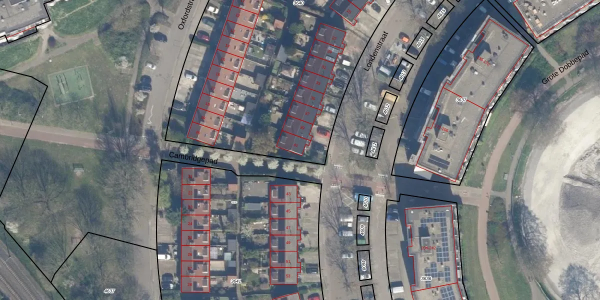 Het perceel waarop Londenstraat 41 staat heeft een oppervlakte van 5381 m². Dit is een zeer groot perceel. De perceeloppervlakte wordt geregistreerd door het Kadaster. Gedetailleerde informatie over de maten van dit perceel kunt u vinden in het rapport Kadastrale kaart met maatvoering van Londenstraat 41.
