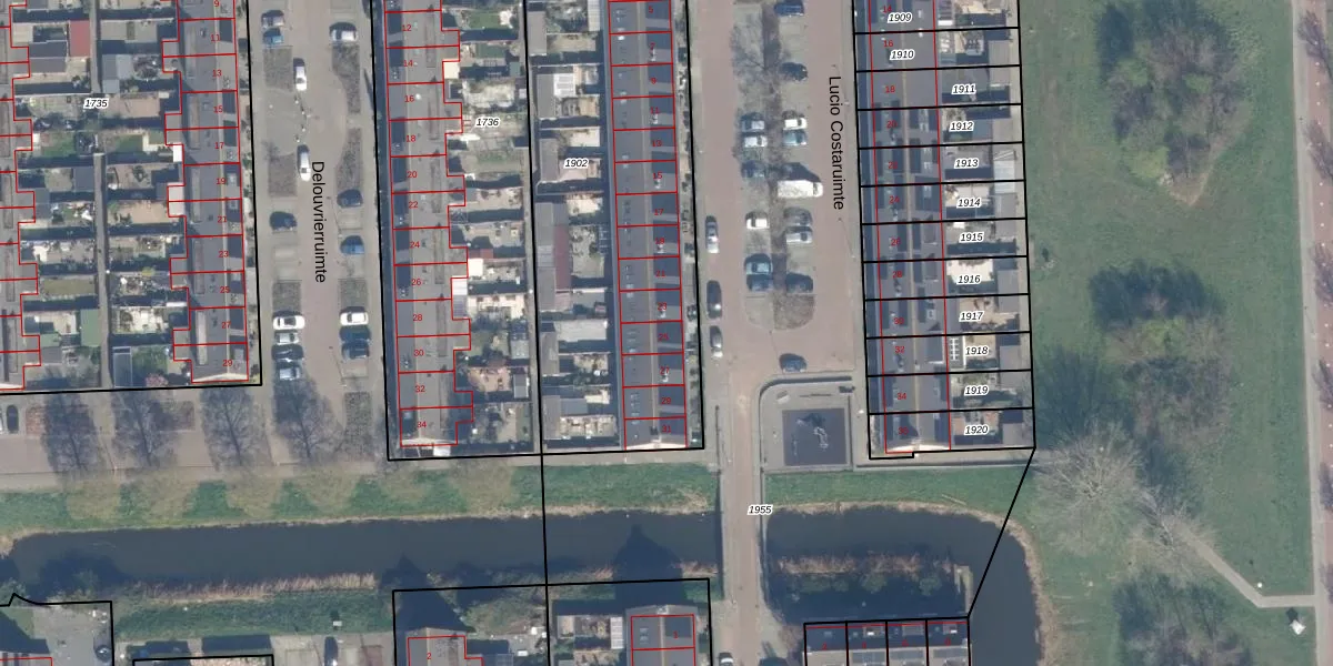Het perceel waarop Lucio Costaruimte 25 staat heeft een oppervlakte van 1903 m². Dit is een zeer groot perceel. De perceeloppervlakte wordt geregistreerd door het Kadaster. Gedetailleerde informatie over de maten van dit perceel kunt u vinden in het rapport Kadastrale kaart met maatvoering van Lucio Costaruimte 25.