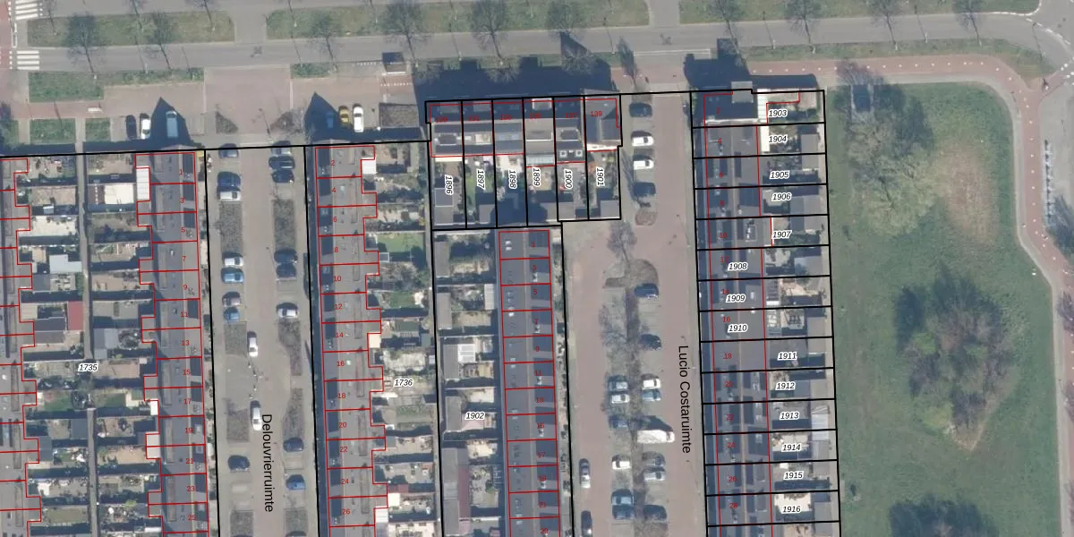 Het perceel waarop Lucio Costaruimte 3 staat heeft een oppervlakte van 1903 m². Dit is een zeer groot perceel. De perceeloppervlakte wordt geregistreerd door het Kadaster. Gedetailleerde informatie over de maten van dit perceel kunt u vinden in het rapport Kadastrale kaart met maatvoering van Lucio Costaruimte 3.