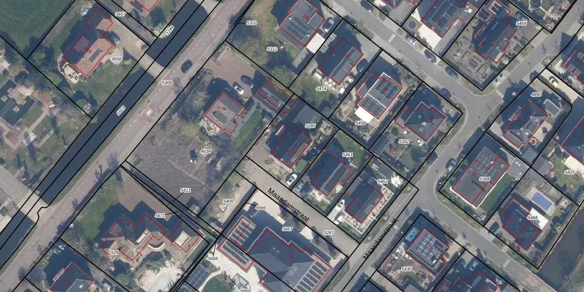 Het perceel waarop Maasdamstraat 12 staat heeft een oppervlakte van 531 m². Dit is een groot perceel. De perceeloppervlakte wordt geregistreerd door het Kadaster. Gedetailleerde informatie over de maten van dit perceel kunt u vinden in het rapport Kadastrale kaart met maatvoering van Maasdamstraat 12.
