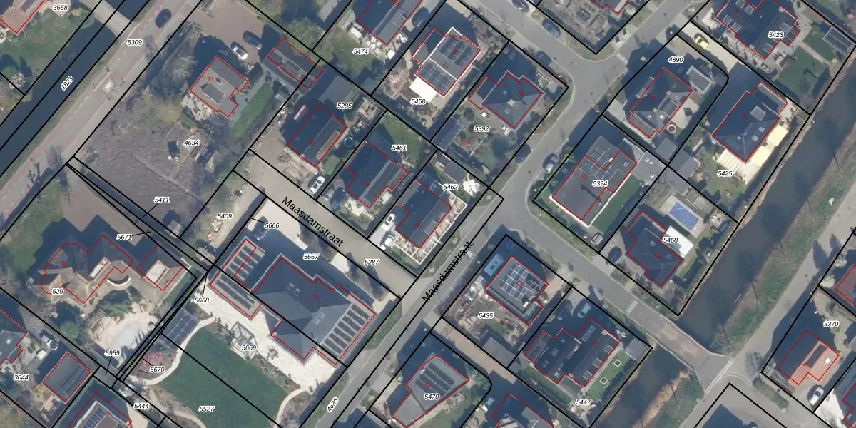 Het perceel waarop Maasdamstraat 16 staat heeft een oppervlakte van 403 m². Dit is een groot perceel. De perceeloppervlakte wordt geregistreerd door het Kadaster. Gedetailleerde informatie over de maten van dit perceel kunt u vinden in het rapport Kadastrale kaart met maatvoering van Maasdamstraat 16.