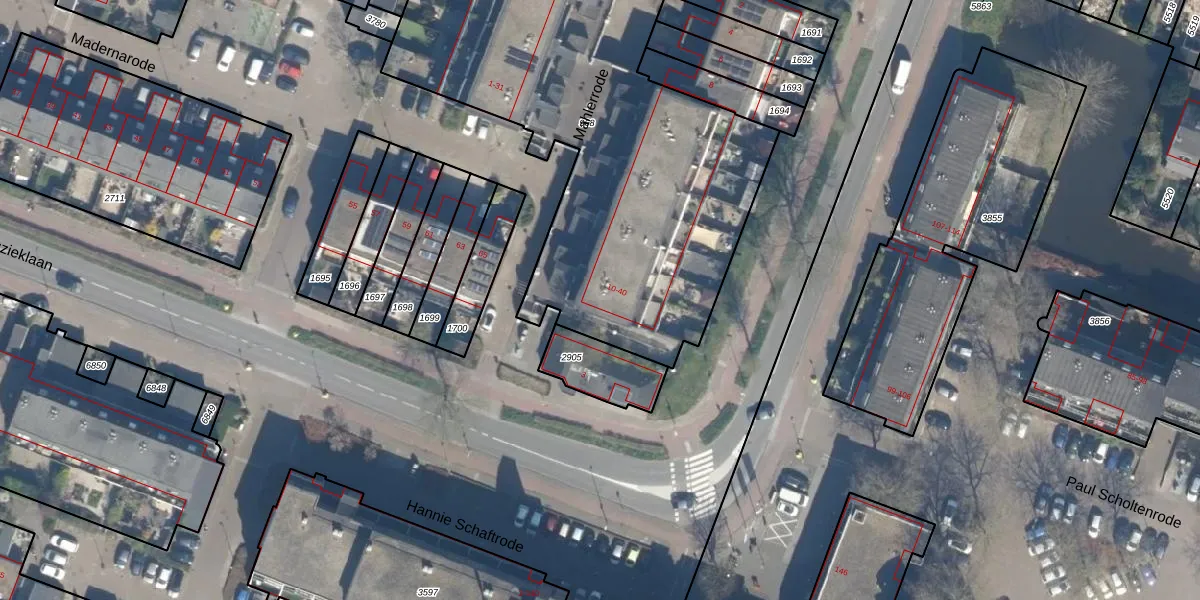 Het perceel waarop Mahlerrode 40 staat heeft een oppervlakte van 2800 m². Dit is een zeer groot perceel. De perceeloppervlakte wordt geregistreerd door het Kadaster. Gedetailleerde informatie over de maten van dit perceel kunt u vinden in het rapport Kadastrale kaart met maatvoering van Mahlerrode 40.