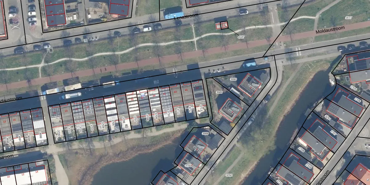 Moldaustroom 45 is gelegen op kadastraal perceel ZWD01F3712. Deze kadastrale aanduiding is uniek en wordt gebruikt door het Kadaster om eigendomsrechten en andere zakelijke rechten vast te leggen. Het perceel maakt onderdeel uit van de kadastrale gemeente Zegwaard.