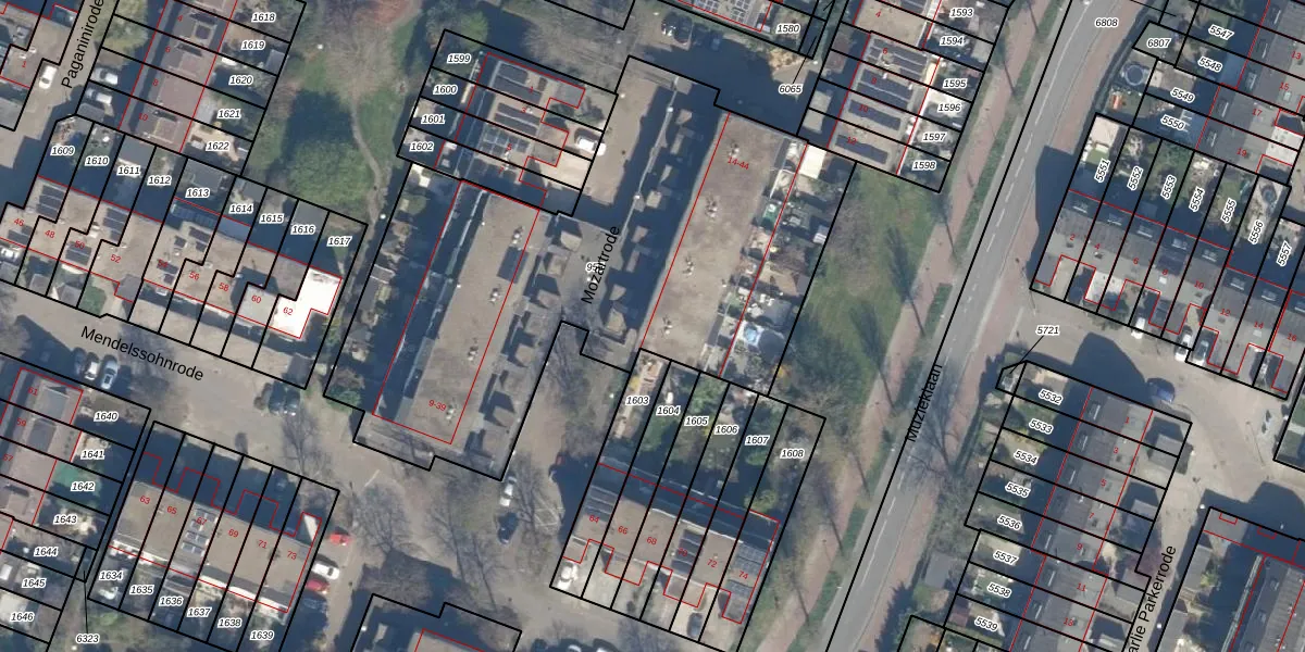 Het perceel waarop Mozartrode 28 staat heeft een oppervlakte van 2775 m². Dit is een zeer groot perceel. De perceeloppervlakte wordt geregistreerd door het Kadaster. Gedetailleerde informatie over de maten van dit perceel kunt u vinden in het rapport Kadastrale kaart met maatvoering van Mozartrode 28.