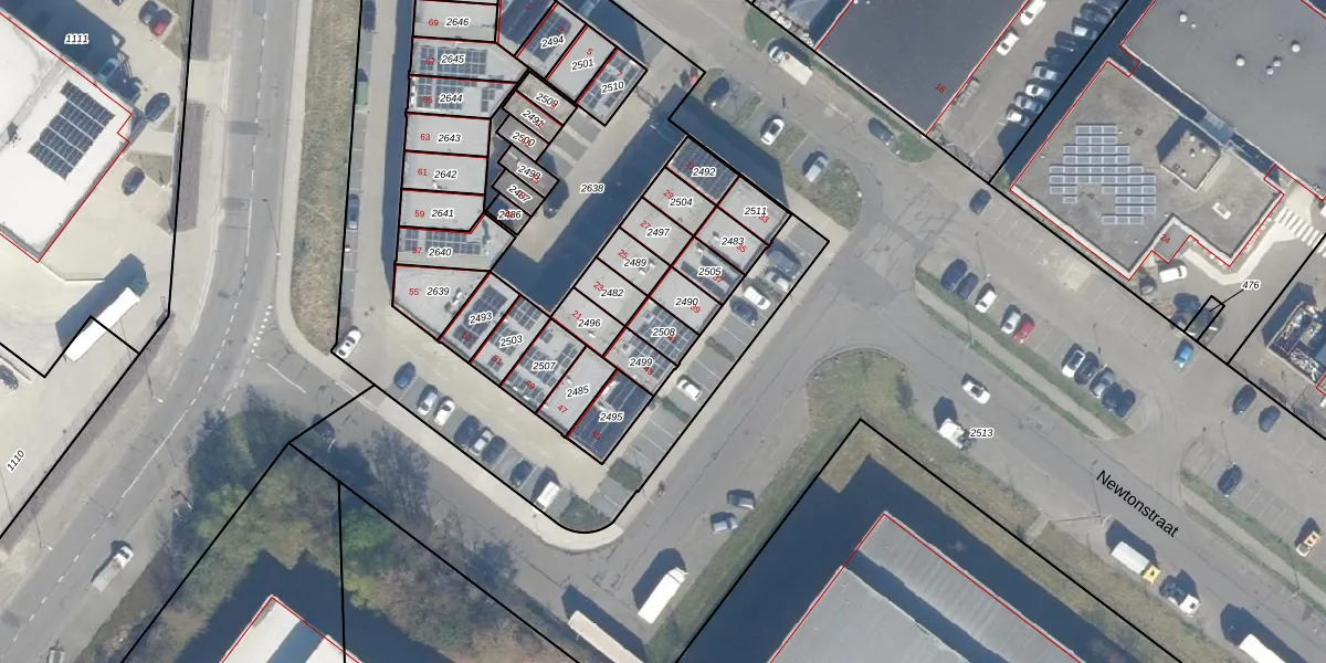 Het perceel waarop Newtonstraat 41 staat heeft een oppervlakte van 56 m². Dit is een klein perceel. De perceeloppervlakte wordt geregistreerd door het Kadaster. Gedetailleerde informatie over de maten van dit perceel kunt u vinden in het rapport Kadastrale kaart met maatvoering van Newtonstraat 41.