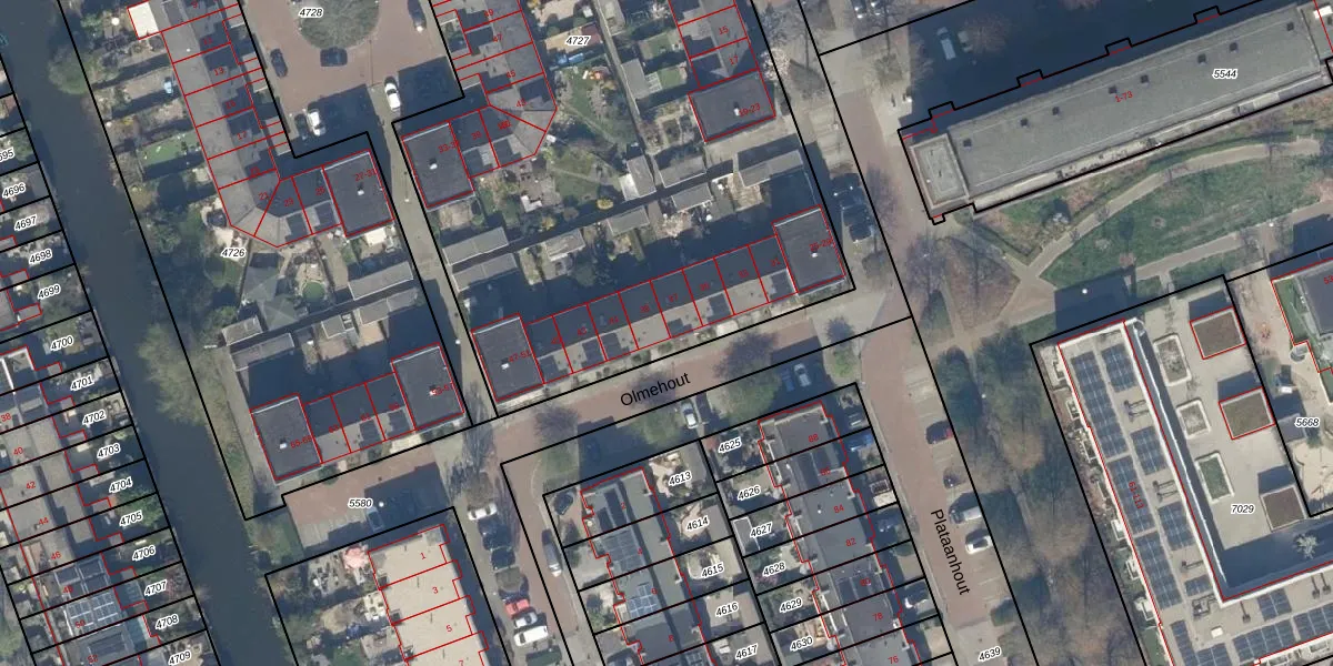Het perceel waarop Olmehout 39 staat heeft een oppervlakte van 4620 m². Dit is een zeer groot perceel. De perceeloppervlakte wordt geregistreerd door het Kadaster. Gedetailleerde informatie over de maten van dit perceel kunt u vinden in het rapport Kadastrale kaart met maatvoering van Olmehout 39.