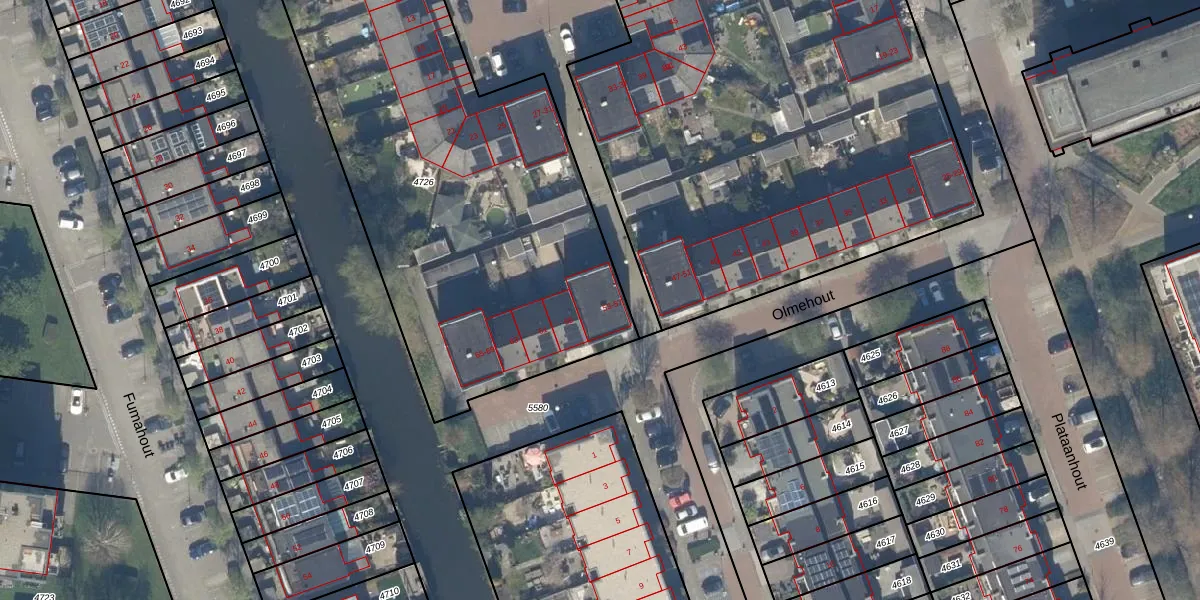 Het perceel waarop Olmehout 55 staat heeft een oppervlakte van 2903 m². Dit is een zeer groot perceel. De perceeloppervlakte wordt geregistreerd door het Kadaster. Gedetailleerde informatie over de maten van dit perceel kunt u vinden in het rapport Kadastrale kaart met maatvoering van Olmehout 55.