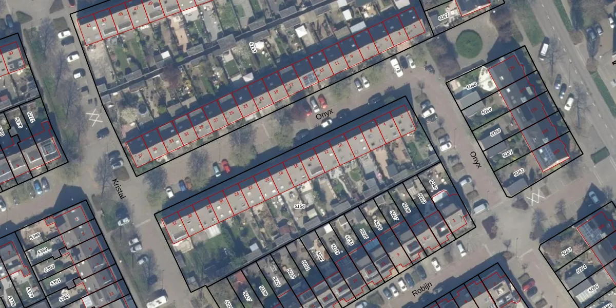 Het perceel waarop Onyx 14 staat heeft een oppervlakte van 2411 m². Dit is een zeer groot perceel. De perceeloppervlakte wordt geregistreerd door het Kadaster. Gedetailleerde informatie over de maten van dit perceel kunt u vinden in het rapport Kadastrale kaart met maatvoering van Onyx 14.