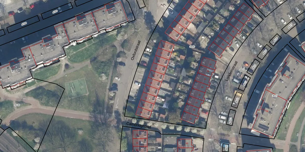 Het perceel waarop Oxfordstraat 15 staat heeft een oppervlakte van 5381 m². Dit is een zeer groot perceel. De perceeloppervlakte wordt geregistreerd door het Kadaster. Gedetailleerde informatie over de maten van dit perceel kunt u vinden in het rapport Kadastrale kaart met maatvoering van Oxfordstraat 15.