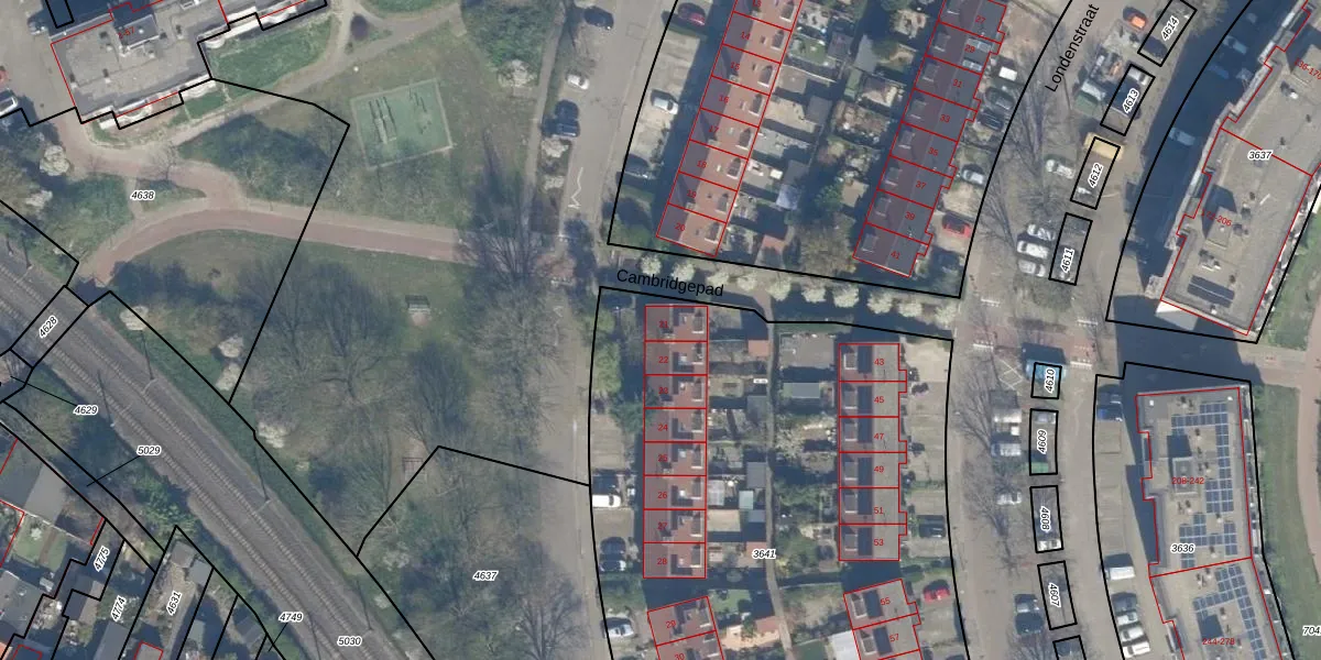 Het perceel waarop Oxfordstraat 21 staat heeft een oppervlakte van 4292 m². Dit is een zeer groot perceel. De perceeloppervlakte wordt geregistreerd door het Kadaster. Gedetailleerde informatie over de maten van dit perceel kunt u vinden in het rapport Kadastrale kaart met maatvoering van Oxfordstraat 21.