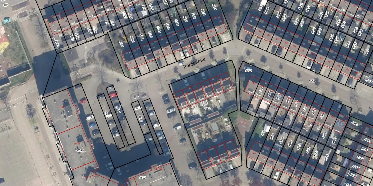 Het perceel waarop Parijsstraat 173 staat heeft een oppervlakte van 1542 m². Dit is een zeer groot perceel. De perceeloppervlakte wordt geregistreerd door het Kadaster. Gedetailleerde informatie over de maten van dit perceel kunt u vinden in het rapport Kadastrale kaart met maatvoering van Parijsstraat 173.
