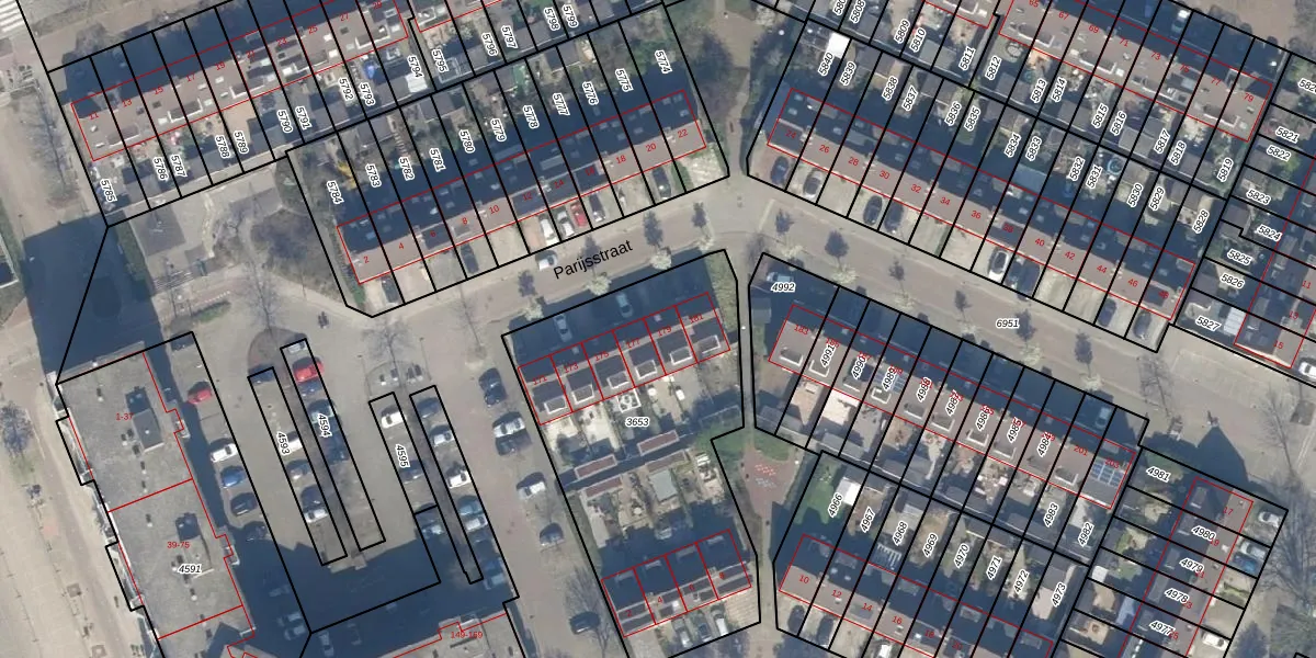 Het perceel waarop Parijsstraat 179 staat heeft een oppervlakte van 1542 m². Dit is een zeer groot perceel. De perceeloppervlakte wordt geregistreerd door het Kadaster. Gedetailleerde informatie over de maten van dit perceel kunt u vinden in het rapport Kadastrale kaart met maatvoering van Parijsstraat 179.