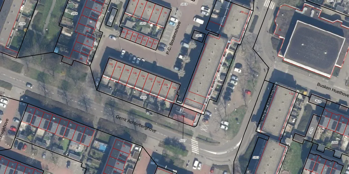 Het perceel waarop P.C. Boutenshove 126 staat heeft een oppervlakte van 2120 m². Dit is een zeer groot perceel. De perceeloppervlakte wordt geregistreerd door het Kadaster. Gedetailleerde informatie over de maten van dit perceel kunt u vinden in het rapport Kadastrale kaart met maatvoering van P.C. Boutenshove 126.
