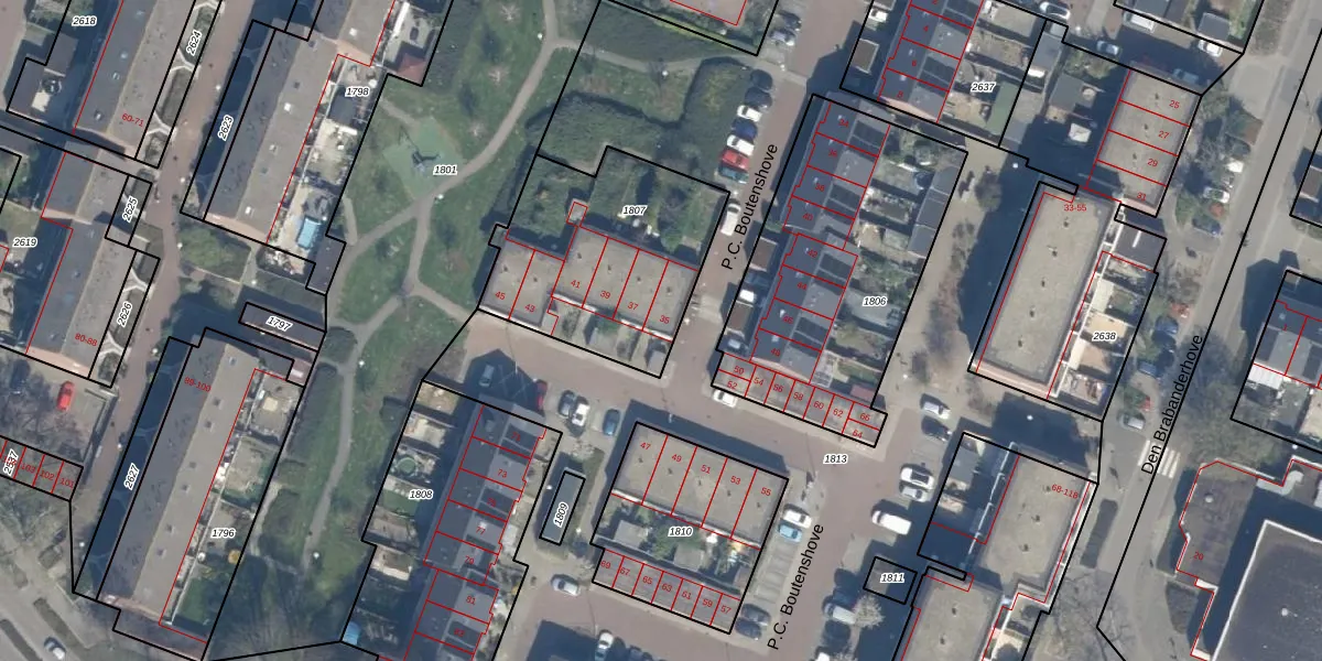 Het perceel waarop P.C. Boutenshove 35 staat heeft een oppervlakte van 843 m². Dit is een groot perceel. De perceeloppervlakte wordt geregistreerd door het Kadaster. Gedetailleerde informatie over de maten van dit perceel kunt u vinden in het rapport Kadastrale kaart met maatvoering van P.C. Boutenshove 35.