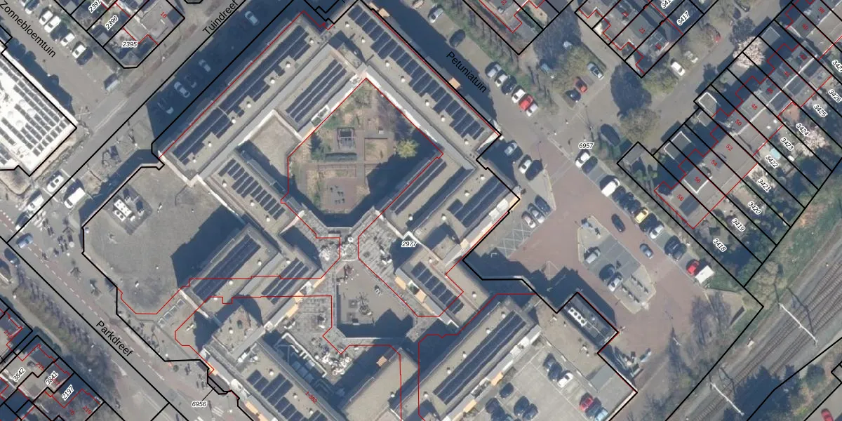 Het perceel waarop Petuniatuin 355 staat heeft een oppervlakte van 9670 m². Dit is een zeer groot perceel. De perceeloppervlakte wordt geregistreerd door het Kadaster. Gedetailleerde informatie over de maten van dit perceel kunt u vinden in het rapport Kadastrale kaart met maatvoering van Petuniatuin 355.