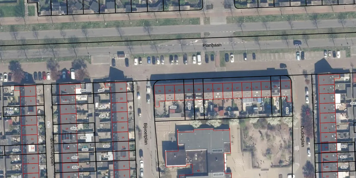 Het perceel waarop Planbaan 35 staat heeft een oppervlakte van 390 m². Dit is een groot perceel. De perceeloppervlakte wordt geregistreerd door het Kadaster. Gedetailleerde informatie over de maten van dit perceel kunt u vinden in het rapport Kadastrale kaart met maatvoering van Planbaan 35.