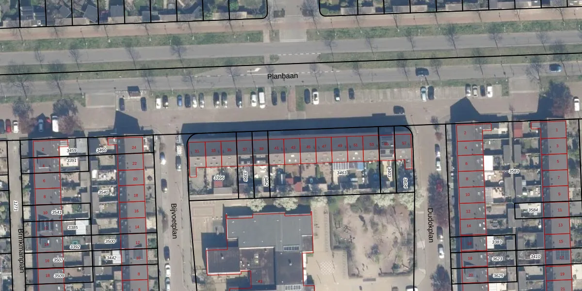 Het perceel waarop Planbaan 43 staat heeft een oppervlakte van 873 m². Dit is een groot perceel. De perceeloppervlakte wordt geregistreerd door het Kadaster. Gedetailleerde informatie over de maten van dit perceel kunt u vinden in het rapport Kadastrale kaart met maatvoering van Planbaan 43.