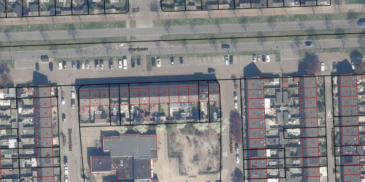 Het perceel waarop Planbaan 51 staat heeft een oppervlakte van 873 m². Dit is een groot perceel. De perceeloppervlakte wordt geregistreerd door het Kadaster. Gedetailleerde informatie over de maten van dit perceel kunt u vinden in het rapport Kadastrale kaart met maatvoering van Planbaan 51.