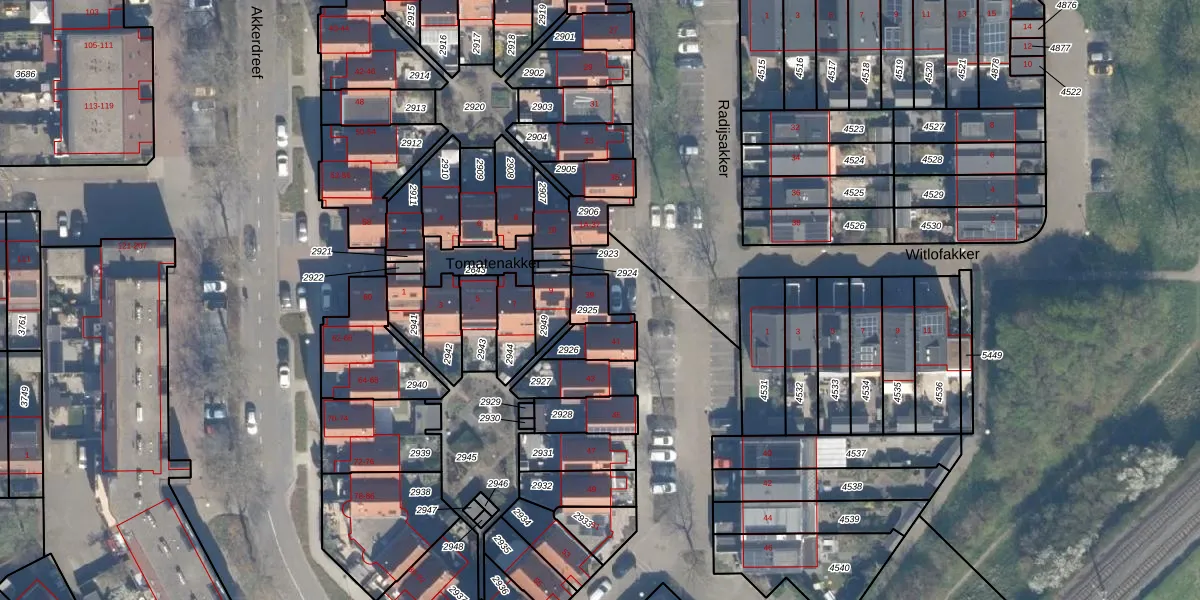 Het perceel waarop Radijsakker 39 staat heeft een oppervlakte van 56 m². Dit is een klein perceel. De perceeloppervlakte wordt geregistreerd door het Kadaster. Gedetailleerde informatie over de maten van dit perceel kunt u vinden in het rapport Kadastrale kaart met maatvoering van Radijsakker 39.