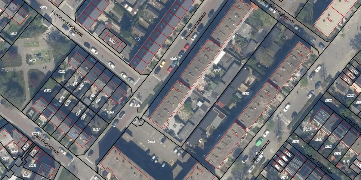 Het perceel waarop Rembrandtstraat 54 staat heeft een oppervlakte van 2503 m². Dit is een zeer groot perceel. De perceeloppervlakte wordt geregistreerd door het Kadaster. Gedetailleerde informatie over de maten van dit perceel kunt u vinden in het rapport Kadastrale kaart met maatvoering van Rembrandtstraat 54.