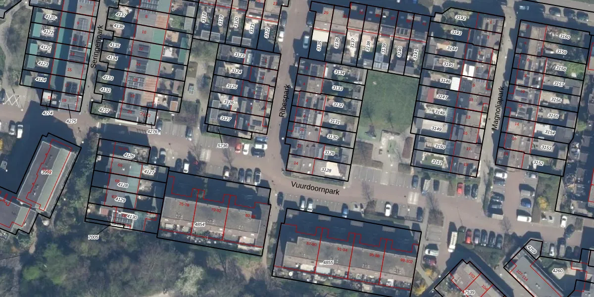 Het perceel waarop Ribespark 12 staat heeft een oppervlakte van 119 m². Dit is een middelgroot perceel. De perceeloppervlakte wordt geregistreerd door het Kadaster. Gedetailleerde informatie over de maten van dit perceel kunt u vinden in het rapport Kadastrale kaart met maatvoering van Ribespark 12.