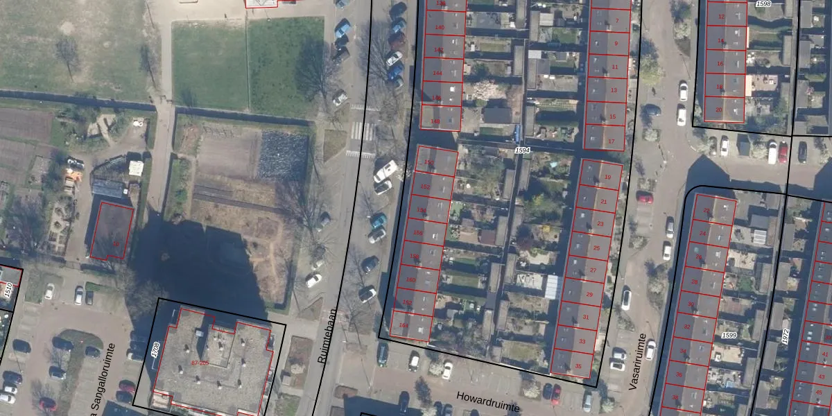 Het perceel waarop Ruimtebaan 154 staat heeft een oppervlakte van 5615 m². Dit is een zeer groot perceel. De perceeloppervlakte wordt geregistreerd door het Kadaster. Gedetailleerde informatie over de maten van dit perceel kunt u vinden in het rapport Kadastrale kaart met maatvoering van Ruimtebaan 154.