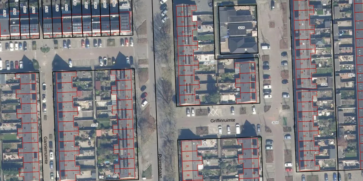 Het perceel waarop Ruimtebaan 48 staat heeft een oppervlakte van 2008 m². Dit is een zeer groot perceel. De perceeloppervlakte wordt geregistreerd door het Kadaster. Gedetailleerde informatie over de maten van dit perceel kunt u vinden in het rapport Kadastrale kaart met maatvoering van Ruimtebaan 48.