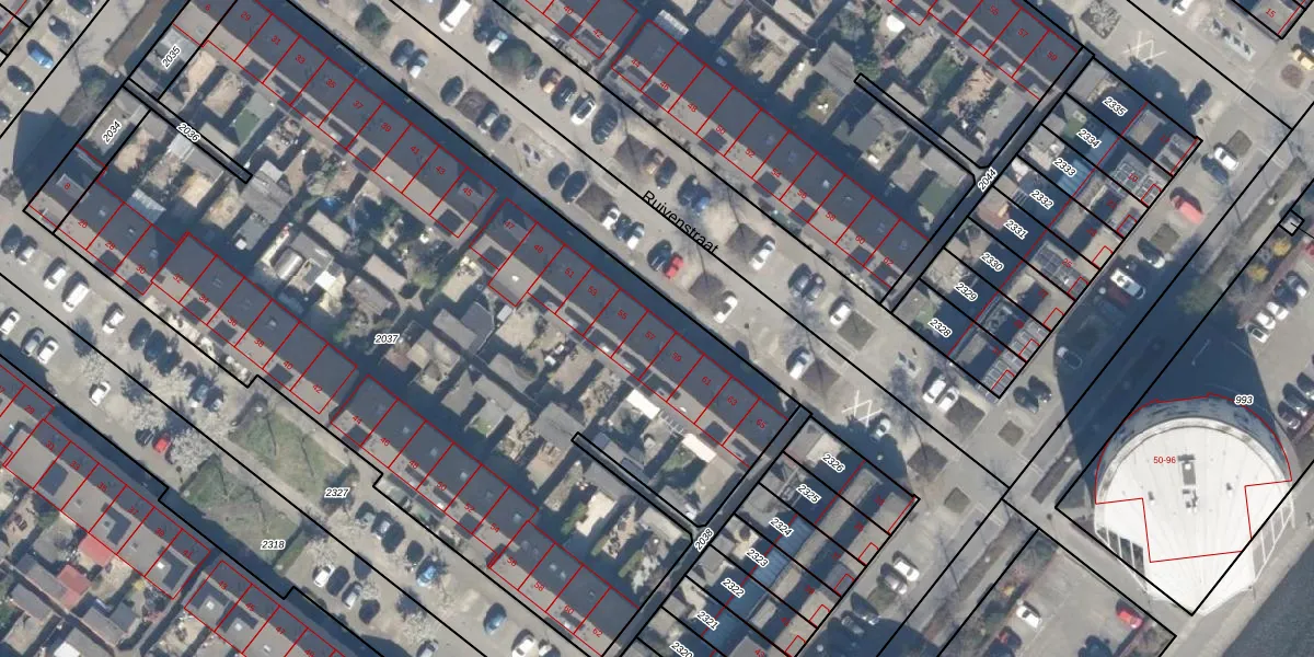 Het perceel waarop Ruivenstraat 57 staat heeft een oppervlakte van 5156 m². Dit is een zeer groot perceel. De perceeloppervlakte wordt geregistreerd door het Kadaster. Gedetailleerde informatie over de maten van dit perceel kunt u vinden in het rapport Kadastrale kaart met maatvoering van Ruivenstraat 57.