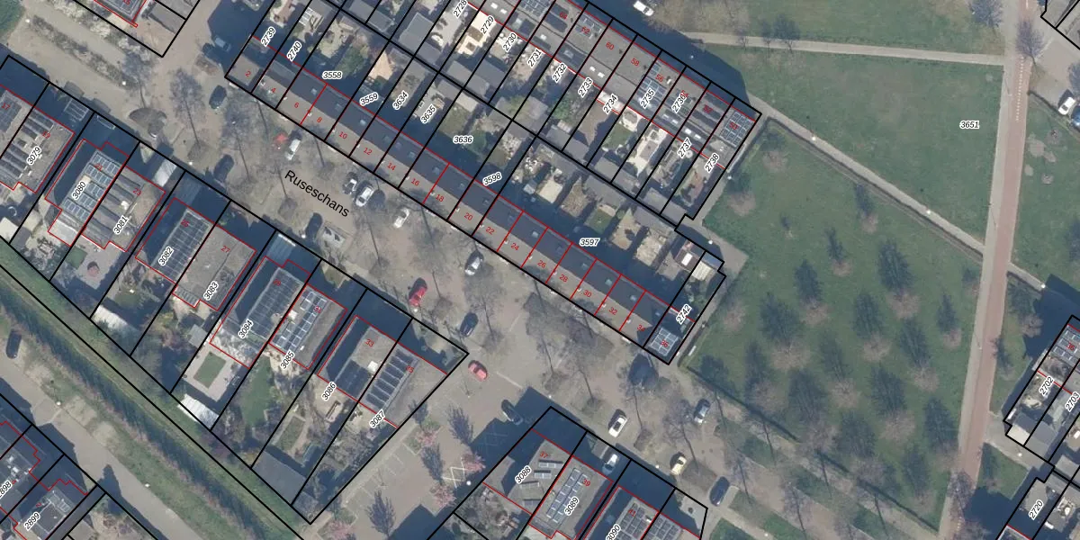 Het perceel waarop Ruseschans 26 staat heeft een oppervlakte van 840 m². Dit is een groot perceel. De perceeloppervlakte wordt geregistreerd door het Kadaster. Gedetailleerde informatie over de maten van dit perceel kunt u vinden in het rapport Kadastrale kaart met maatvoering van Ruseschans 26.