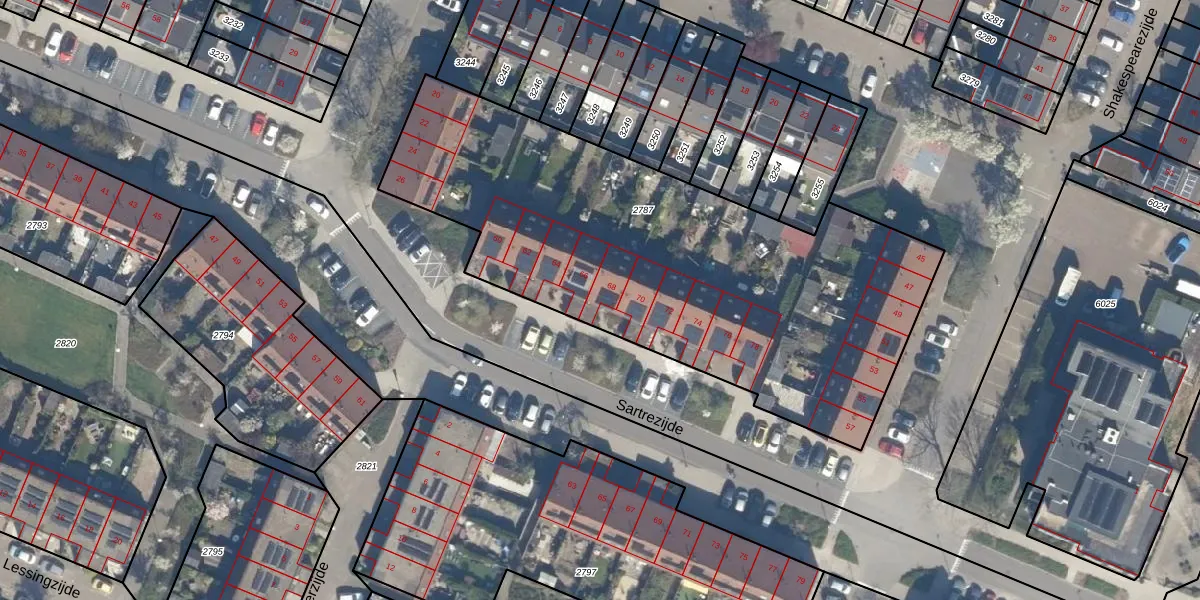 Het perceel waarop Sartrezijde 68 staat heeft een oppervlakte van 2593 m². Dit is een zeer groot perceel. De perceeloppervlakte wordt geregistreerd door het Kadaster. Gedetailleerde informatie over de maten van dit perceel kunt u vinden in het rapport Kadastrale kaart met maatvoering van Sartrezijde 68.