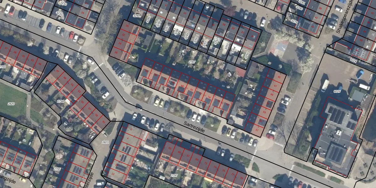 Het perceel waarop Sartrezijde 70 staat heeft een oppervlakte van 2593 m². Dit is een zeer groot perceel. De perceeloppervlakte wordt geregistreerd door het Kadaster. Gedetailleerde informatie over de maten van dit perceel kunt u vinden in het rapport Kadastrale kaart met maatvoering van Sartrezijde 70.