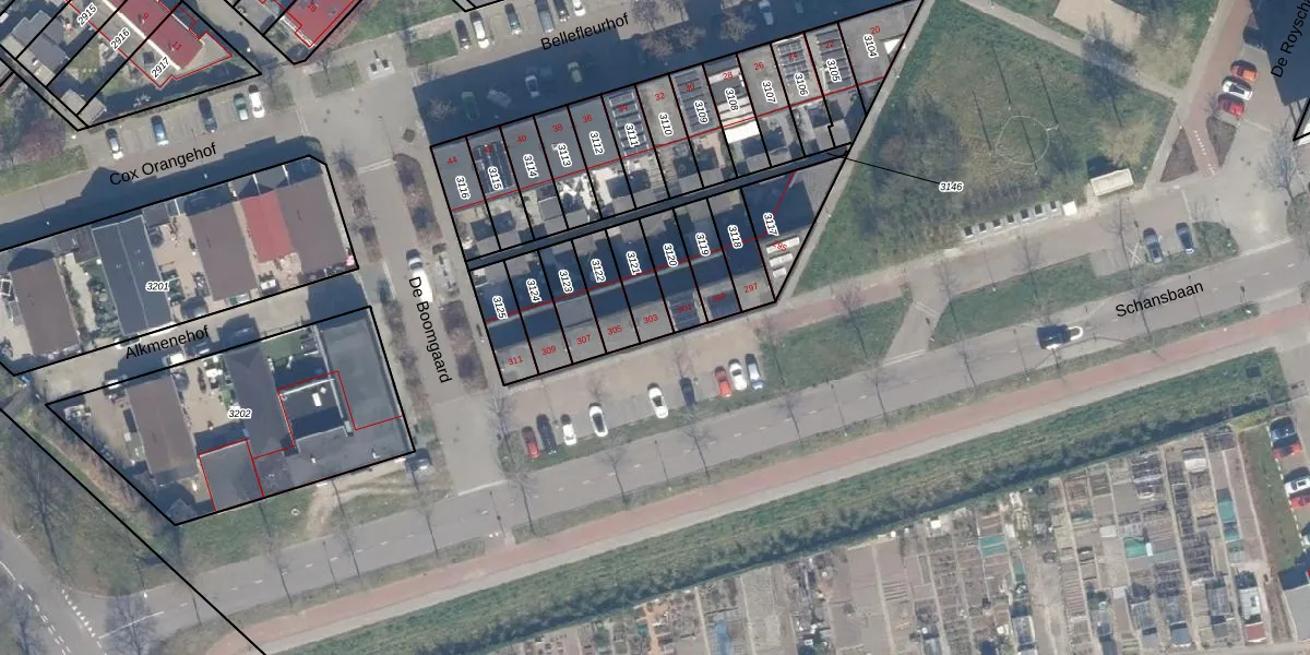Het perceel waarop Schansbaan 303 staat heeft een oppervlakte van 99 m². Dit is een klein perceel. De perceeloppervlakte wordt geregistreerd door het Kadaster. Gedetailleerde informatie over de maten van dit perceel kunt u vinden in het rapport Kadastrale kaart met maatvoering van Schansbaan 303.