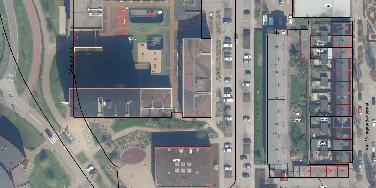 Het perceel waarop Schoutenhoek 88 staat heeft een oppervlakte van 5865 m². Dit is een zeer groot perceel. De perceeloppervlakte wordt geregistreerd door het Kadaster. Gedetailleerde informatie over de maten van dit perceel kunt u vinden in het rapport Kadastrale kaart met maatvoering van Schoutenhoek 88.