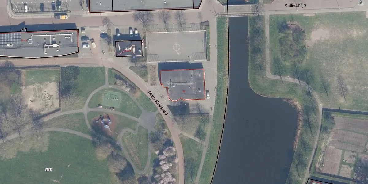 Het perceel waarop Sullivanlijn 31 staat heeft een oppervlakte van 3,8 ha. Dit is een zeer groot perceel. De perceeloppervlakte wordt geregistreerd door het Kadaster. Gedetailleerde informatie over de maten van dit perceel kunt u vinden in het rapport Kadastrale kaart met maatvoering van Sullivanlijn 31.
