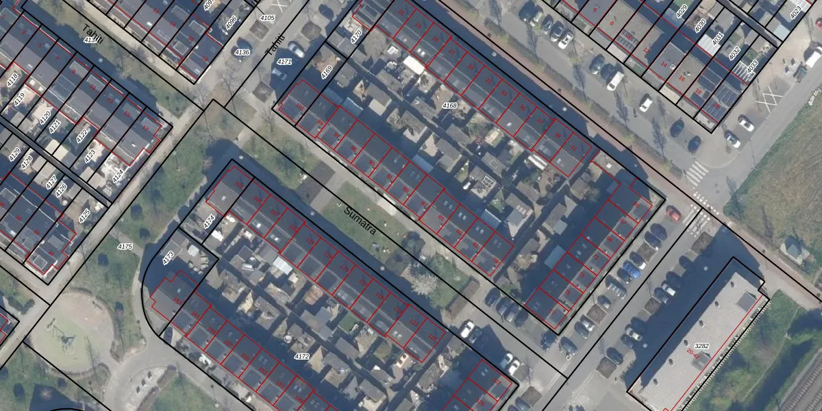 Het perceel waarop Sumatra 87 staat heeft een oppervlakte van 3440 m². Dit is een zeer groot perceel. De perceeloppervlakte wordt geregistreerd door het Kadaster. Gedetailleerde informatie over de maten van dit perceel kunt u vinden in het rapport Kadastrale kaart met maatvoering van Sumatra 87.