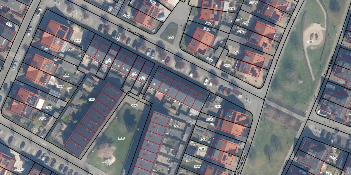 Het perceel waarop Taagstroom 21 staat heeft een oppervlakte van 1984 m². Dit is een zeer groot perceel. De perceeloppervlakte wordt geregistreerd door het Kadaster. Gedetailleerde informatie over de maten van dit perceel kunt u vinden in het rapport Kadastrale kaart met maatvoering van Taagstroom 21.
