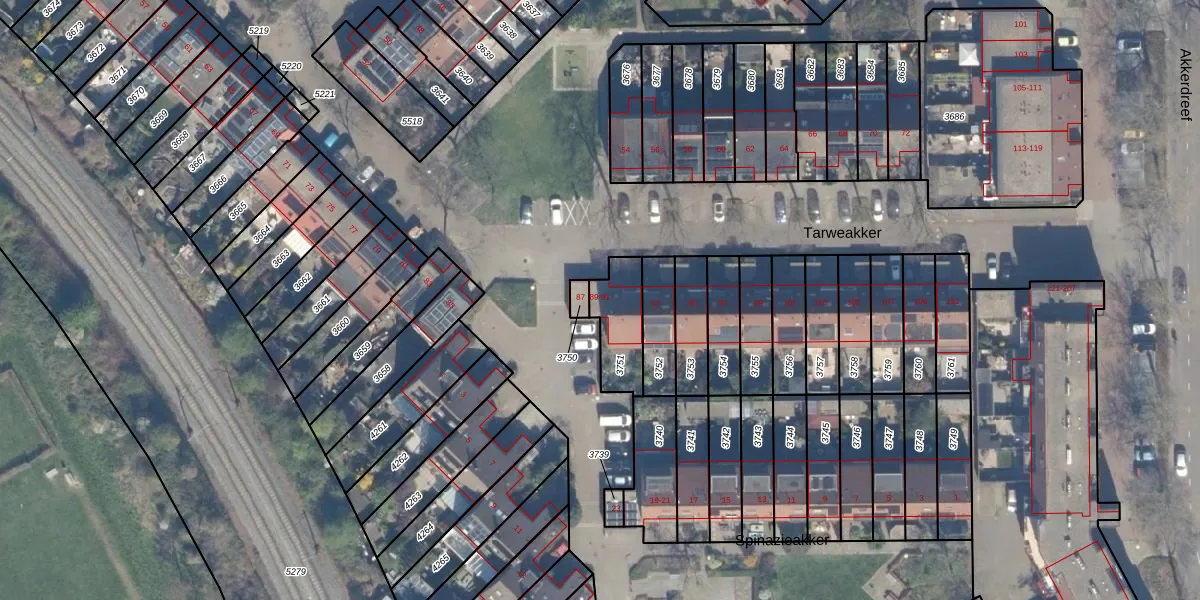 Het perceel waarop Tarweakker 89 staat heeft een oppervlakte van 163 m². Dit is een middelgroot perceel. De perceeloppervlakte wordt geregistreerd door het Kadaster. Gedetailleerde informatie over de maten van dit perceel kunt u vinden in het rapport Kadastrale kaart met maatvoering van Tarweakker 89.