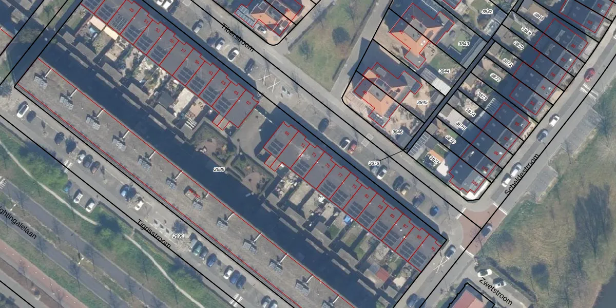 Het perceel waarop Tiberstroom 73 staat heeft een oppervlakte van 6770 m². Dit is een zeer groot perceel. De perceeloppervlakte wordt geregistreerd door het Kadaster. Gedetailleerde informatie over de maten van dit perceel kunt u vinden in het rapport Kadastrale kaart met maatvoering van Tiberstroom 73.