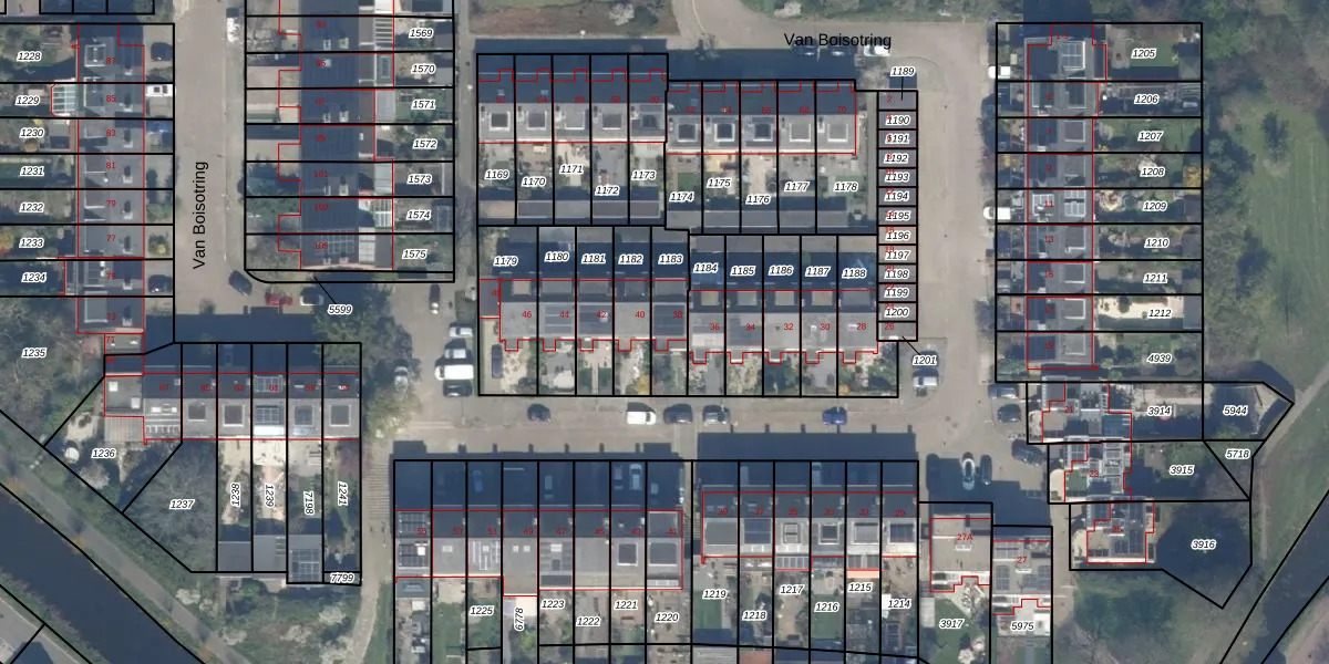 Het perceel waarop Van Boisotring 38 staat heeft een oppervlakte van 142 m². Dit is een middelgroot perceel. De perceeloppervlakte wordt geregistreerd door het Kadaster. Gedetailleerde informatie over de maten van dit perceel kunt u vinden in het rapport Kadastrale kaart met maatvoering van Van Boisotring 38.