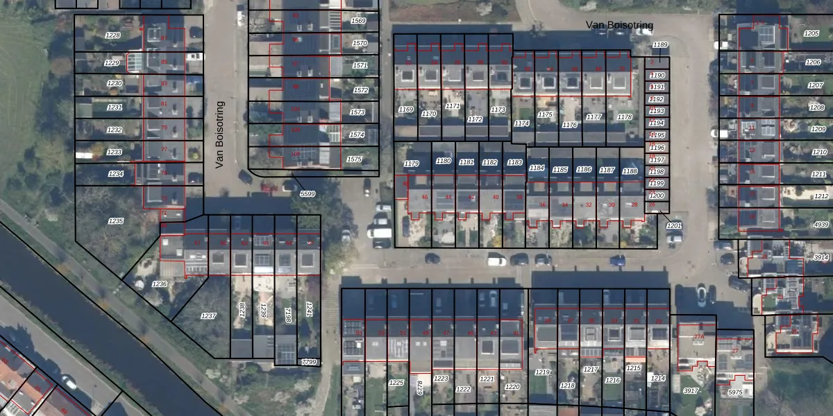 Het perceel waarop Van Boisotring 46 staat heeft een oppervlakte van 238 m². Dit is een middelgroot perceel. De perceeloppervlakte wordt geregistreerd door het Kadaster. Gedetailleerde informatie over de maten van dit perceel kunt u vinden in het rapport Kadastrale kaart met maatvoering van Van Boisotring 46.