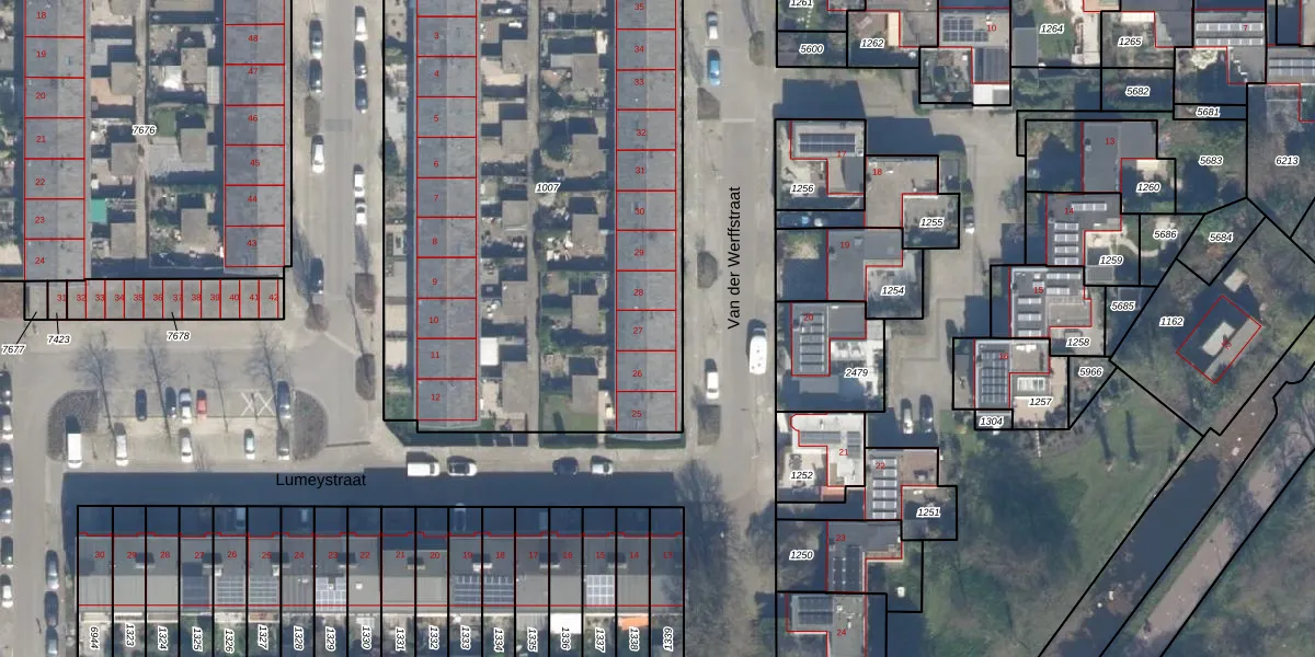 Het perceel waarop Van der Werffstraat 27 staat heeft een oppervlakte van 3415 m². Dit is een zeer groot perceel. De perceeloppervlakte wordt geregistreerd door het Kadaster. Gedetailleerde informatie over de maten van dit perceel kunt u vinden in het rapport Kadastrale kaart met maatvoering van Van der Werffstraat 27.