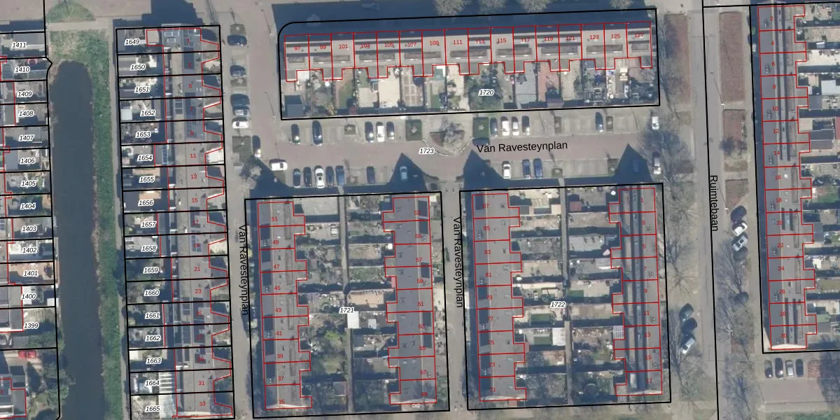 Het perceel waarop Van Ravesteynplan 53 staat heeft een oppervlakte van 2430 m². Dit is een zeer groot perceel. De perceeloppervlakte wordt geregistreerd door het Kadaster. Gedetailleerde informatie over de maten van dit perceel kunt u vinden in het rapport Kadastrale kaart met maatvoering van Van Ravesteynplan 53.