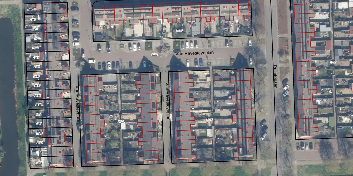 Het perceel waarop Van Ravesteynplan 85 staat heeft een oppervlakte van 2516 m². Dit is een zeer groot perceel. De perceeloppervlakte wordt geregistreerd door het Kadaster. Gedetailleerde informatie over de maten van dit perceel kunt u vinden in het rapport Kadastrale kaart met maatvoering van Van Ravesteynplan 85.