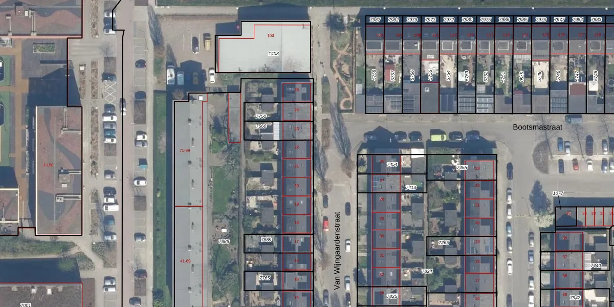 Het perceel waarop Van Wijngaardenstraat 22 staat heeft een oppervlakte van 2881 m². Dit is een zeer groot perceel. De perceeloppervlakte wordt geregistreerd door het Kadaster. Gedetailleerde informatie over de maten van dit perceel kunt u vinden in het rapport Kadastrale kaart met maatvoering van Van Wijngaardenstraat 22.