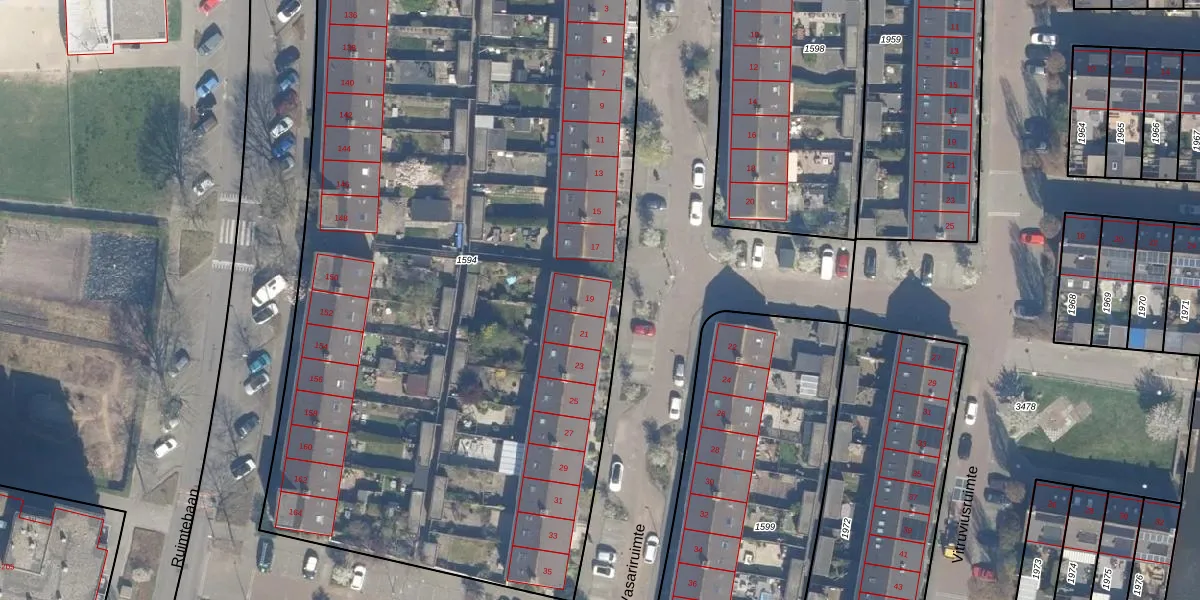Het perceel waarop Vasariruimte 19 staat heeft een oppervlakte van 5615 m². Dit is een zeer groot perceel. De perceeloppervlakte wordt geregistreerd door het Kadaster. Gedetailleerde informatie over de maten van dit perceel kunt u vinden in het rapport Kadastrale kaart met maatvoering van Vasariruimte 19.