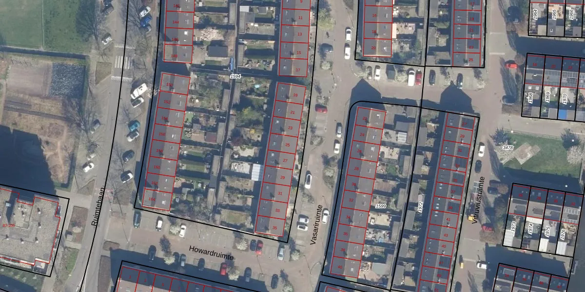 Het perceel waarop Vasariruimte 25 staat heeft een oppervlakte van 5615 m². Dit is een zeer groot perceel. De perceeloppervlakte wordt geregistreerd door het Kadaster. Gedetailleerde informatie over de maten van dit perceel kunt u vinden in het rapport Kadastrale kaart met maatvoering van Vasariruimte 25.
