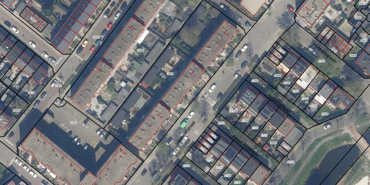 Het perceel waarop Vermeerstraat 45 staat heeft een oppervlakte van 2566 m². Dit is een zeer groot perceel. De perceeloppervlakte wordt geregistreerd door het Kadaster. Gedetailleerde informatie over de maten van dit perceel kunt u vinden in het rapport Kadastrale kaart met maatvoering van Vermeerstraat 45.