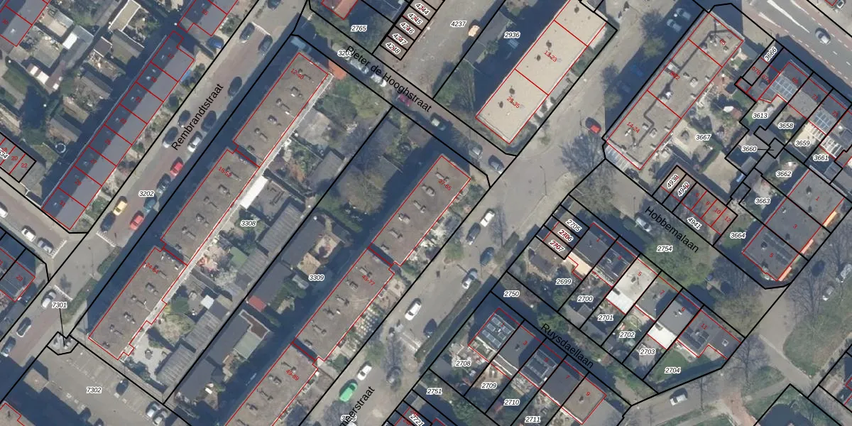 Het perceel waarop Vermeerstraat 59 staat heeft een oppervlakte van 2566 m². Dit is een zeer groot perceel. De perceeloppervlakte wordt geregistreerd door het Kadaster. Gedetailleerde informatie over de maten van dit perceel kunt u vinden in het rapport Kadastrale kaart met maatvoering van Vermeerstraat 59.