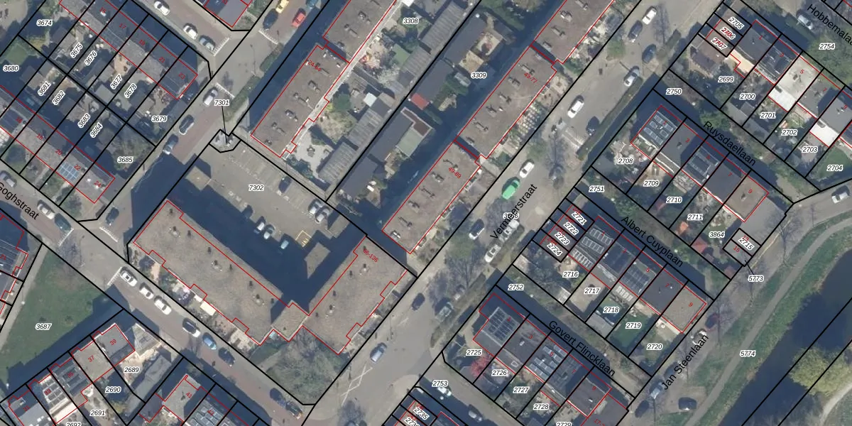 Het perceel waarop Vermeerstraat 85 staat heeft een oppervlakte van 2566 m². Dit is een zeer groot perceel. De perceeloppervlakte wordt geregistreerd door het Kadaster. Gedetailleerde informatie over de maten van dit perceel kunt u vinden in het rapport Kadastrale kaart met maatvoering van Vermeerstraat 85.