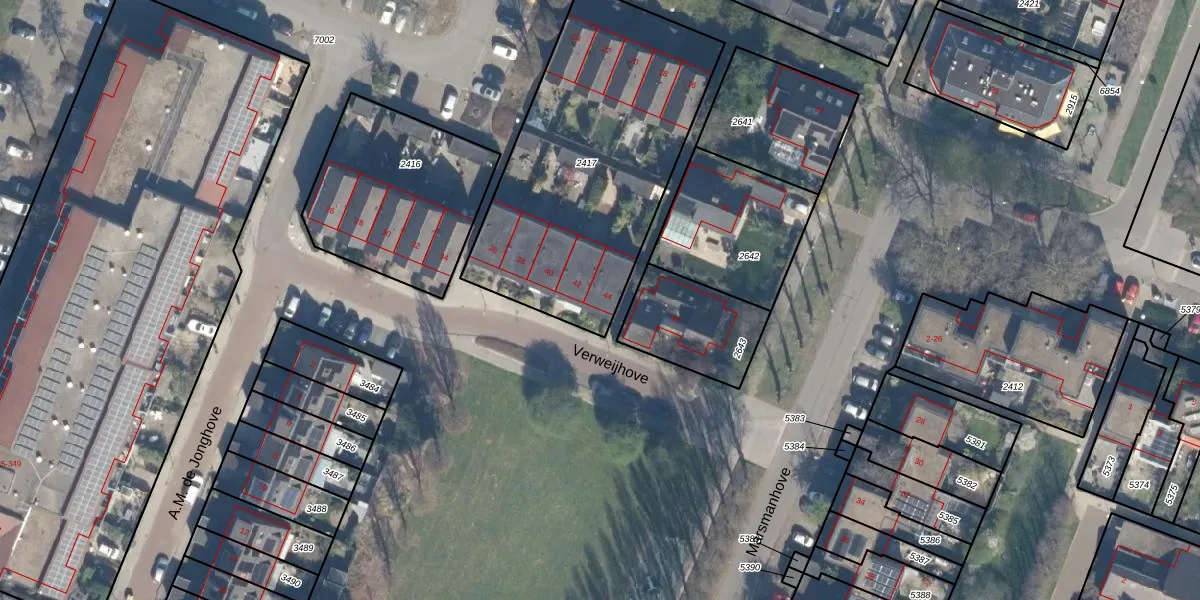 Het perceel waarop Verweijhove 44 staat heeft een oppervlakte van 1379 m². Dit is een zeer groot perceel. De perceeloppervlakte wordt geregistreerd door het Kadaster. Gedetailleerde informatie over de maten van dit perceel kunt u vinden in het rapport Kadastrale kaart met maatvoering van Verweijhove 44.